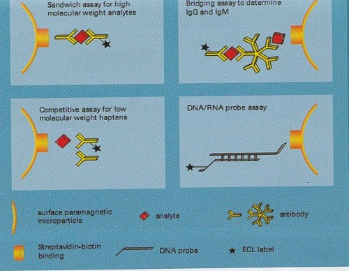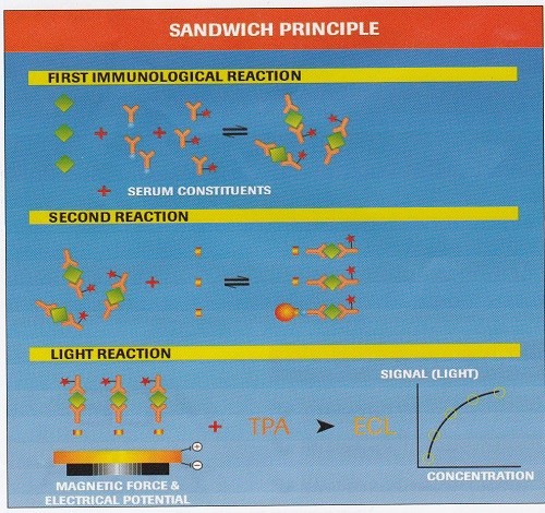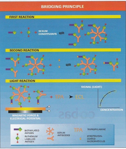 پایه و اساس ECL در استفاده از کمپلکس روتنیوم تریس 4 و تریپروپیلامین (TPA) می باشد که محصول نهایی به صورت نور قابل اندازه گیری است. آغاز واکنش توسط جریان الکتریکی بوده که در پایان منجر به تولید نور از کمپلکس روتنیوم تریس خواهد شد. در این مرحله ولتاژی الکتریکی به کمپلکس ایمنولوژیک روتنیوم تریس اعمال می شود که این کمپلکس به استرپتوآویدین پوشیده شده در سطح میکروپارتیکل ها متصل شده است. استفاده از واکنش الکتریکی از مزایای این روش می باشد که می توان دقیقاً کل واکنش را تحت کنترل قرار داد.